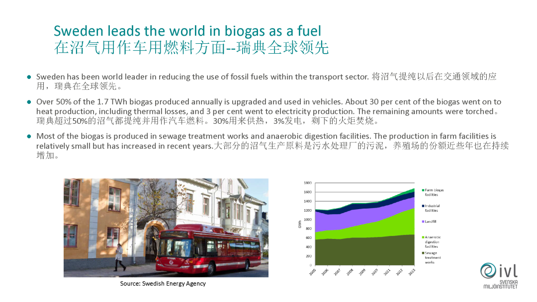 另外一個特色,瑞典的沼氣生產(chǎn)出來,不是像我們傳統(tǒng)中國所提的是農(nóng)業(yè)沼氣,它是工業(yè)化的,是完全經(jīng)過提純和壓縮,用到它的公交車里或者環(huán)衛(wèi)的車輛里,是這樣循環(huán)使用的。它的沼氣提純用在交通領域的應用在全球也是最領先的,超過一半的沼氣都是用在汽車燃料里。比如左側的大公交車,隨處可見的大公交車,上面有一個小頂子,這里面裝的就是沼氣,壓縮和提純以后的沼氣。