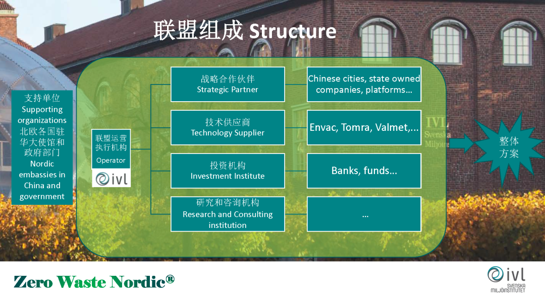 第一個就是在生態(tài)管理,生態(tài)治理方面,第二個就是通過政策的借鑒,第三個就是公民老百姓的參與,第四個就是創(chuàng)新和技術。在技術方面我們現(xiàn)在有這樣一些探索。我們成立了北歐無廢城市技術和投資聯(lián)盟這樣一個機構,這個機構是由我們瑞典環(huán)科院成立的和運營的。我們邀請四位合作伙伴加入到我們這個聯(lián)盟,形成一個類似于航空母艦的整體解決方案,想為中國市場做一些服務。
