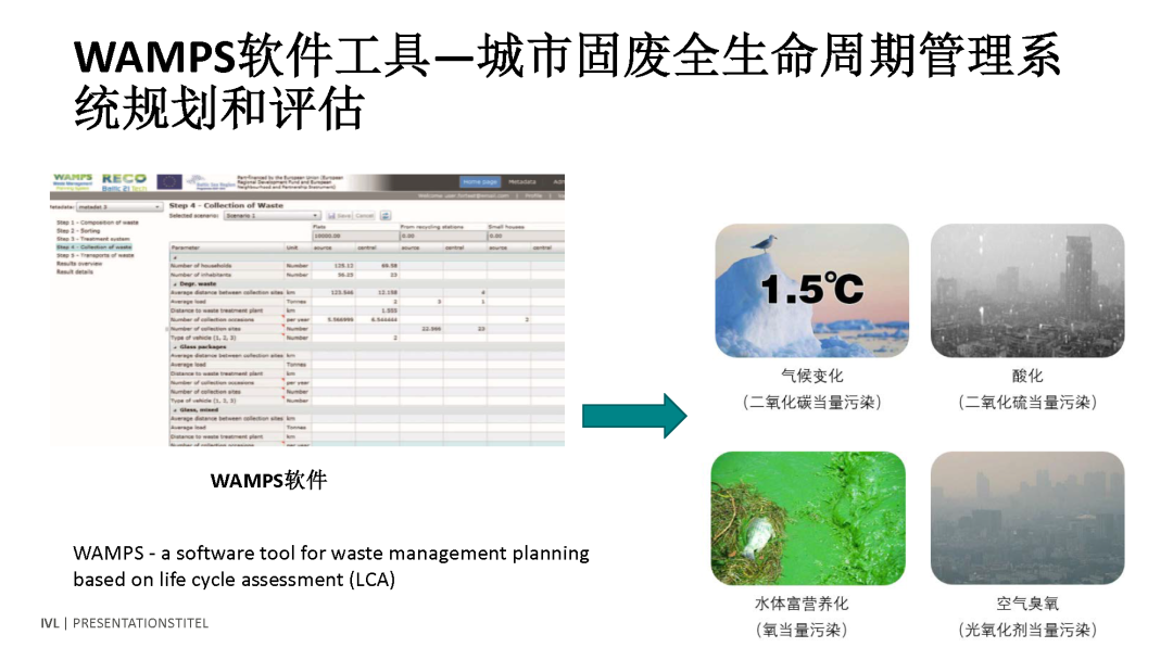 為什么說我們在前面有一個五階梯的概念,我們想讓垃圾管理盡量避免產(chǎn)生,這樣的話,對碳排放和碳中和是更加有效的。這個計算是很復雜的,是基于我們自己的軟件工具。對城市的垃圾管理有一個全生命周期的管理和系統(tǒng),可以從垃圾成分分析到垃圾收集、轉運、分類到終端的處理,整個全生命周期我們要算一下它的環(huán)境影響,我們算的一個是二氧化碳它的排放,另外包括酸雨酸化的影響,包括對水體富營養(yǎng)化的影響,包括對空氣臭氧的影響,我們用工具算一下,通過這樣的計算方法可以比較出來哪一種垃圾管理的方法對城市來說它的全生命周期的環(huán)境影響最小。