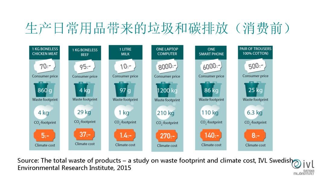 這個圖片想跟大家分享我們的一個研究報告,這是我們之前對我們日常生活中所使用的一些產(chǎn)品的垃圾排放和碳排放的一些研究,我們選擇了一些代表性的日常消費品。比如我們吃的肉還有牛奶、電腦、手機等等,我們舉一個例子來說,比如說我們在買一部手機之前,它所產(chǎn)生的垃圾,在它生產(chǎn)和加工之前的垃圾就已經(jīng)有86公斤。這個量是非常大,它所帶來的碳排放已經(jīng)是110公斤,這也是非常大的。