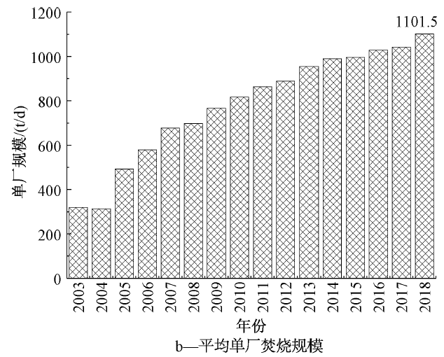 1)焚燒廠建設(shè):中國垃圾焚燒發(fā)電應(yīng)用始于1989年的深圳,全國垃圾焚燒廠從2003年的47家發(fā)展到2018年底已建成投入運(yùn)行331座,處置規(guī)模達(dá)到36.36萬t/d(合1.33億t/a),見圖1a。另根據(jù)蕪湖生態(tài)中心調(diào)研,2019年4月底有428家垃圾焚燒發(fā)電廠投入運(yùn)行,并且216家正在建設(shè)。平均單廠處理規(guī)模也不斷上升,從2003年的319 t/d發(fā)展到2018年的1101 t/d,見圖1b;同時(shí)單廠最大規(guī)模不斷提高,其中上海于2019年建成6000 t/d的老港再生能源利用中心。