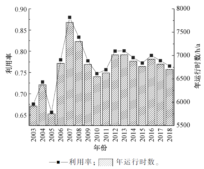 3)焚燒廠實(shí)際運(yùn)行:由于垃圾焚燒廠存在檢修維護(hù)以及部分區(qū)域超前建設(shè)等原因,建設(shè)安裝規(guī)模不等于實(shí)際處理能力。根據(jù)建設(shè)規(guī)模和實(shí)際焚燒量的統(tǒng)計(jì)數(shù)據(jù),折算得到垃圾焚燒廠能力利用率。由圖3可看出:處理能力利用率存在波動(dòng),最高出現(xiàn)在2007年(0.88)。將焚燒量折算到滿負(fù)荷運(yùn)行的小時(shí)數(shù),2007年為7708 h,2018年為6704 h,近10年來年運(yùn)行平均時(shí)數(shù)均未達(dá)到7200 h。運(yùn)行小時(shí)數(shù)也會(huì)直接影響發(fā)電量。根據(jù)中電聯(lián)網(wǎng)站信息,垃圾焚燒廠2011年聯(lián)網(wǎng)裝機(jī)量為209.7萬kW,上網(wǎng)電量為97.23億kW·h,到2018年聯(lián)網(wǎng)裝機(jī)量達(dá)到889萬kW,上網(wǎng)電量為481億kW·h,折合節(jié)約標(biāo)煤1480萬t(圖4)。入廠垃圾發(fā)電量為300~400 kW·h/t,熱發(fā)電效率為25%~30%。同時(shí)由于各廠技術(shù)、運(yùn)行水平及廠區(qū)建設(shè)差異,廠內(nèi)用電占比為15%~20%,因此上網(wǎng)電量水平為255~340 kW·h/t。根據(jù)浙江省發(fā)改委公布數(shù)據(jù)統(tǒng)計(jì),浙江省內(nèi)垃圾焚燒廠平均上網(wǎng)發(fā)電量287 kW·h/t。國家發(fā)展改革委《關(guān)于完善垃圾焚燒發(fā)電價(jià)格政策的通知》規(guī)定,生活垃圾焚燒廠生活垃圾折算上網(wǎng)電量暫定為280 kW·h/t,并按照該限值進(jìn)行分類補(bǔ)貼。