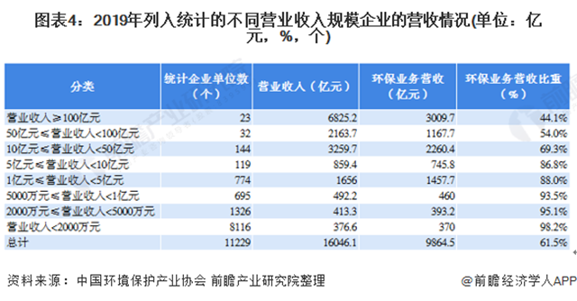 營業(yè)收入規(guī)模越小的企業(yè),環(huán)保業(yè)務營業(yè)收入在總營業(yè)收入中所占比重越高,其環(huán)保專業(yè)化程度也越高,營業(yè)收入超過l00億元的企業(yè),環(huán)保業(yè)務營業(yè)收入平均占比為44.l%,營業(yè)收入小于2000萬元的企業(yè),其環(huán)保業(yè)務營業(yè)收入平均占比達98.2%。