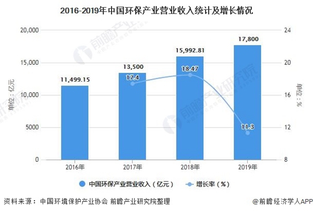 盡管受到2018年產業(yè)發(fā)展流動性危機余波及中美貿易摩擦的影響,2019年一些環(huán)保企業(yè)依然面臨著經(jīng)營危機,但總體來看,2019年環(huán)保產業(yè)整體發(fā)展態(tài)勢趨好,持續(xù)保持了較快發(fā)展。據(jù)中國環(huán)境保護產業(yè)協(xié)會測算數(shù)據(jù),2019年全國環(huán)保產業(yè)營業(yè)收入約17800億元,較2018年增長約11.3%。
