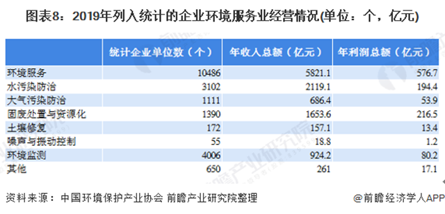 據(jù)環(huán)境保護產業(yè)協(xié)會數(shù)據(jù),2019年我國列入統(tǒng)計的環(huán)境服務企業(yè)共10486個,年收入總額為5281.1億元,年利潤總額為576.7億元。