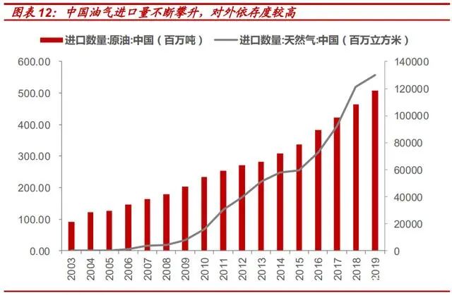 從進口細分數(shù)據(jù)看,石油、天然氣等能源進口量占整體進口量的13.28%, 僅次于芯片等關(guān)鍵技術(shù)部件,礦產(chǎn)占比達到 9%。作為我國制造業(yè)的“血 液”,近年來,我國這兩項進口的需求和對外依存度呈增加趨勢:2019 年,原油進口達 5.1 億噸,增長 9.5%,對外依存度升至 72.45%,天然 氣進口 9656 萬噸,增長 6.9%,對外依存度為 44%,油氣主要進口國為 美俄、沙特等中東國家。根據(jù) IRENA 數(shù)據(jù),2019 年中國陸上風電、太 陽能光伏、水電累計裝機規(guī)模分別占全球總量的 34%、35%、27%,碳 中和目標路徑下,新舊能源結(jié)構(gòu)的轉(zhuǎn)變有助于提升中國國內(nèi)大循環(huán)下的 供給側(cè)的上游資源可控。
