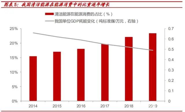 實際上,伴隨政府對新能源領(lǐng)域的研究與使用的倡導(dǎo),2014-2019 年我 國單位 GDP 能耗已經(jīng)出現(xiàn)連續(xù)下滑,我國能源利用效率逐年增長。2019 年,我國每萬元 GDP 消費 0.49 噸標準煤,較 2018 年下降 4.84%。清 潔能源在能源消費中的比重就增長至 23.4%,但傳統(tǒng)的煤炭、石油占比 分別為 57.7%、18.9%,仍是我國主要的能源消耗來源。