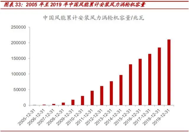 縱向?qū)Ρ?,中國累計安裝風力渦輪機容量在 2019 年約 210478 兆瓦, 同比 2012 年增長了 241.7%。同時中國風電累計裝機容量也持續(xù)穩(wěn)定增 長超過十年,截至 2019 年 12 月 31 日已達到 236402 兆瓦,與 2012 年相比同比增長 213.85%。橫向?qū)Ρ龋?019 年中國風能消耗達到 3.62 百億億焦耳,遠超于美德英法等歐美發(fā)達國家,該數(shù)值占據(jù)全球總風能 消耗量的 28%。截至 2019 年,中國可再生能源發(fā)電總裝機容量 7.9 億 千瓦,約占全球可再生能源發(fā)電總裝機的 30%。其中,水電、風電、光 伏發(fā)電、生物質(zhì)發(fā)電裝機容量分別達 3.56 億千瓦、2.1 億千瓦、2.04 億 千瓦、2369 萬千瓦,均位居世界首位。