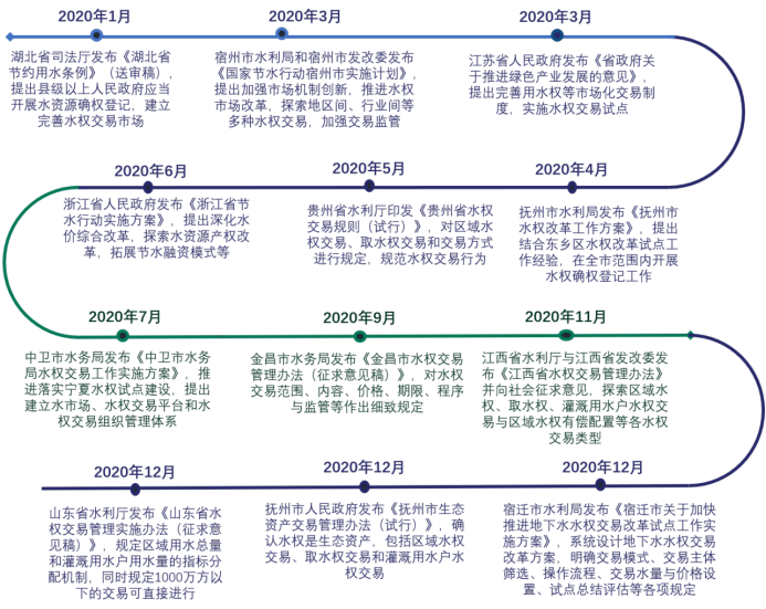 相比2019年,2020年全國地方級政策出臺進(jìn)度明顯加快,水權(quán)制度設(shè)計進(jìn)一步優(yōu)化。不僅有多個省著手進(jìn)行水權(quán)的確權(quán)登記工作,將區(qū)域水權(quán)、取水權(quán)和灌溉用水戶水權(quán)交易納入相關(guān)政策規(guī)定,也有部分省份進(jìn)行制度創(chuàng)新,如江西省將區(qū)域水權(quán)有償配置納入水權(quán)交易范疇,對部分水權(quán)進(jìn)行行政區(qū)域內(nèi)的有償分配,進(jìn)一步提高水資源價值;浙江省進(jìn)一步提出將探索水價綜合改革、拓展節(jié)水融資模式,拓寬水權(quán)價值實現(xiàn)范疇;宿遷市出臺水權(quán)改革方案,對地下水取水權(quán)交易的各項規(guī)定進(jìn)行明確規(guī)定,對水權(quán)交易納入新產(chǎn)品提供制度參考。
