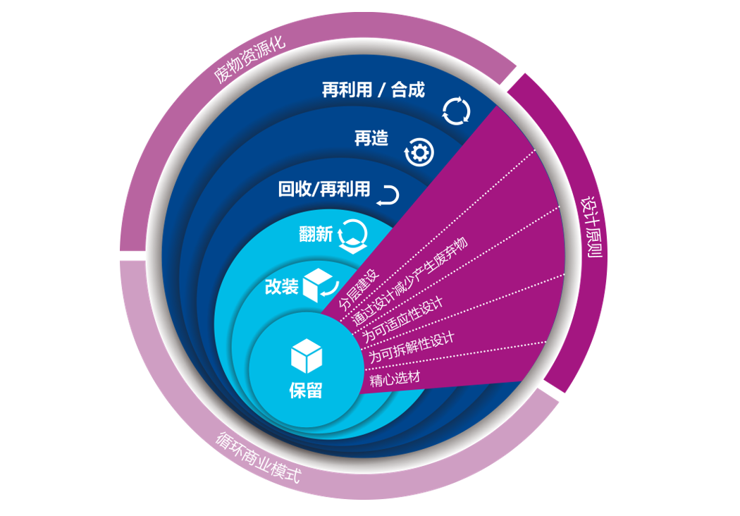 《倫敦規(guī)劃2021》的政策SI7中對(duì)循環(huán)經(jīng)濟(jì)模式定義[2]道:“盡可能長(zhǎng)時(shí)間維持材料的最高價(jià)值,然后重復(fù)使用或回收利用,以盡可能地減少?gòu)U棄物的產(chǎn)生?!?/span>