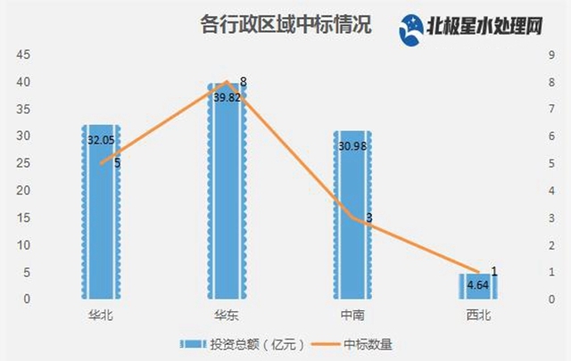 從行政區(qū)域來看,華東地區(qū)依靠江蘇、浙江、江西、安徽、福建、山東8大項目釋放近40億市場;華北地區(qū)借力河北以及山西的5大項目落定訂單超32億元;另外,中南地區(qū)投資總額同樣超30億元。