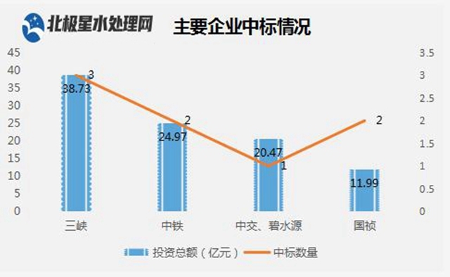 值得注意的是,這4大10億級訂單中,有兩大項目被三峽系收入囊中,累計投資超30億元,而最大一單則被中交+碧水源聯(lián)合體攜手摘得。