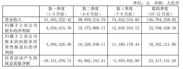 綜合分季度主要財(cái)務(wù)數(shù)據(jù)(圖2)來看,第一季度較為穩(wěn)定,收入是3149.5萬元;第二季度收入逐漸樂觀,達(dá)到了9885.9萬元;第三季度有些許下降,收入為7464.2萬元;第四季度收入明顯增長,達(dá)到了1.47億元,且凈利潤和現(xiàn)金流動凈額都有大幅的增長。