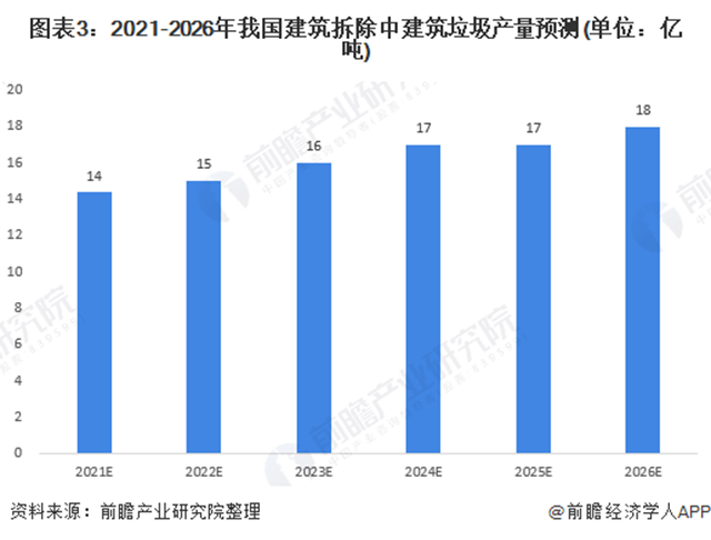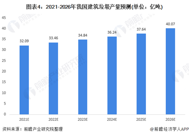 前瞻根據(jù)初步預(yù)測(cè)到2021年我國(guó)需要處理的建筑垃圾產(chǎn)量將達(dá)到32.09億噸,2026年,產(chǎn)量有望突破40億噸;若以35元/噸(運(yùn)輸費(fèi)與處置費(fèi))計(jì)算,預(yù)計(jì)2021年建筑垃圾處理市場(chǎng)規(guī)模將超過(guò)1400億元。