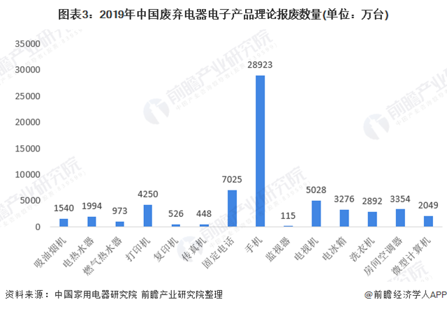 在新公布的《廢棄電器電子產品處理目錄(2014年版)》中,類型有所增加,包含電視機、電冰箱、洗衣機、房間空調器、微型計算機、吸油煙機、電熱水器、燃氣熱水器、打印機、復印機、傳真機、固定電話、手機、監(jiān)視器等14類產品。從各類廢棄電器電子產品理論報廢數量上看,2019年,手機理論報廢量較大,遠多于其他廢棄電器電子產品,達28923萬臺。