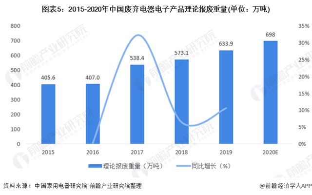 根據中國家用電器研究院數據顯示,2015年以來,我國廢棄電器電子產品理論報廢重量逐年上升,2019年,我國廢棄電器電子產品理論報廢重量達633.9萬噸,2020年約接近700萬噸。