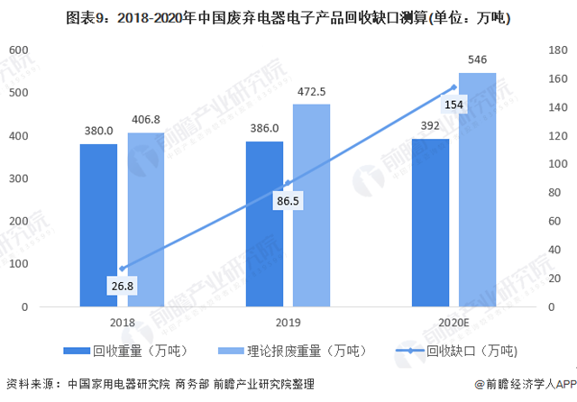 綜合2018-2019年中國家用電器研究院公布的廢棄電器電子產品修正的理論報廢重量及商務部所發(fā)布的廢棄電器電子產品回收重量可發(fā)現(xiàn),2018-2019年,我國首批廢棄電器電子目錄產品理論報廢重量高于回收重量,回收缺口上升。2019年,我國首批廢棄電器電子目錄產品回收缺口達86.5萬噸,回收量占理論報廢量比重為82%。根據變化趨勢,2020年,回收缺口約達154萬噸。