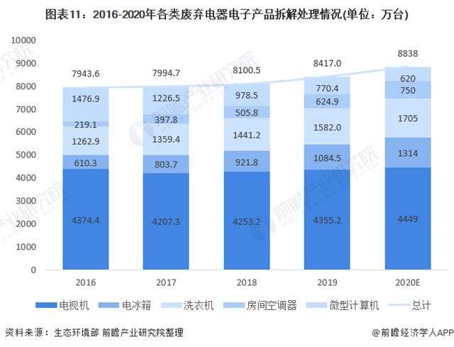 2016-2019年,電視機拆解量變化較為平穩(wěn),電冰箱、洗衣機、微型計算機拆解處理量分別以21%、8%、-20%的增長率復合增長,房間空調器增長率逐年下降,2020年約降至20%。依此增長率進行測算,2020年,電視機、電冰箱、洗衣機、房間空調器、微型計算機拆解量約分別為4449萬臺、1314萬臺、1705萬臺、750萬臺、620萬臺,總計約達8838萬臺。