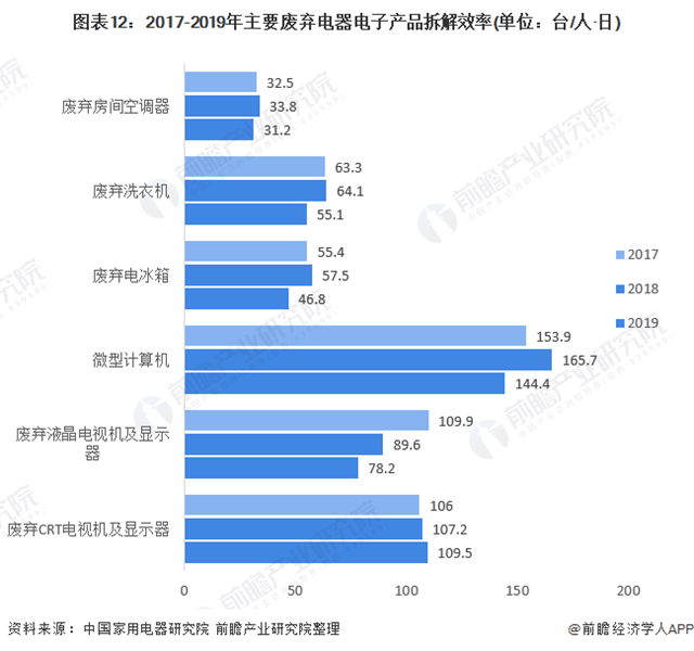 從拆解效率上看,2017-2019年,我國廢棄液晶電視機產品拆解效率逐年下降,而其他廢棄電器電子產品拆解效率變化并不明顯。