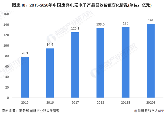 從回收價值看,根據商務部數據,2015-2018年中國廢棄電器電子產品回收價值整體呈增長趨勢,2018年達133億元。根據我國廢棄電器電子產品回收數量與回收重量比率,2019年,我國廢棄電器電子產品回收價值約達135億元,2020年約達141億元。