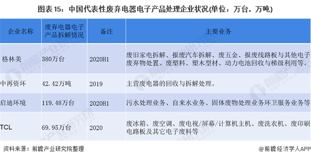 具體來看,2020年上半年,格林美廢棄電器電子產品拆解量達380萬臺,啟迪環(huán)境廢棄電器電子產品拆解量達119.48萬臺,TCL拆解量達69.95萬臺,中再資環(huán)拆解處理量達42.42萬噸。
