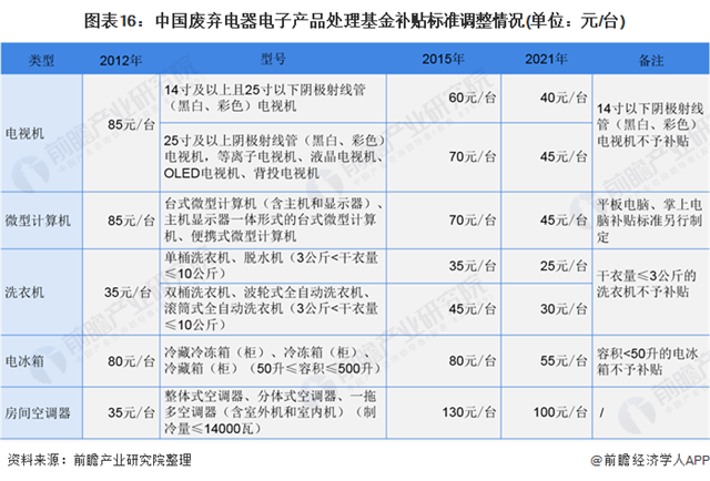 2021年3月,《關于調整廢棄電器電子產品處理基金補貼標準的通知》發(fā)布,對廢棄電器電子產品處理基金補貼標準予以調整。其中,電視機補貼范圍為40-45元/臺,微型計算機45元/臺,洗衣機25-30元/臺,電冰箱55元/臺,房間空調器100元/臺??傮w來看,與2015年基金補貼標準相比,補貼標準下降。