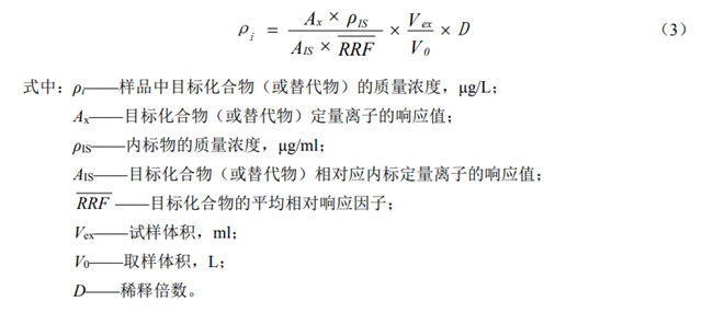 當目標化合物(或替代物)采用平均相對響應因子進行校準時,樣品中目標化合物(或替代物)的質(zhì)量濃度(μg/L),按照公式(3)進行計算: