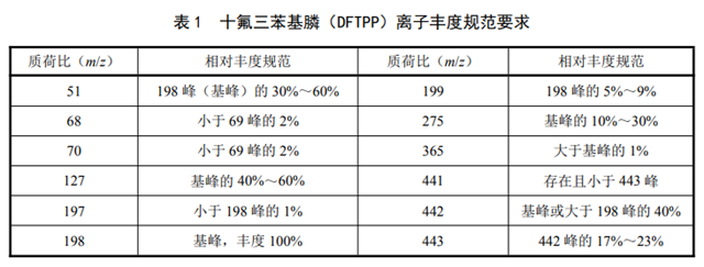 每次分析前,應進行質(zhì)譜自動調(diào)諧,再將氣相色譜和質(zhì)譜儀設(shè)定至分析方法要求的儀器條件,并處于待機狀態(tài),通過氣相色譜進樣直接注入 1.0 µl 十氟三苯基膦使用液(4.15),對整個系統(tǒng)進行檢查,每運行 12 h 檢查一次,得到十氟三苯基膦質(zhì)譜圖,其質(zhì)量碎片的離子的豐度應全部符合表 1 中的要求。否則須清洗質(zhì)譜儀離子源。
