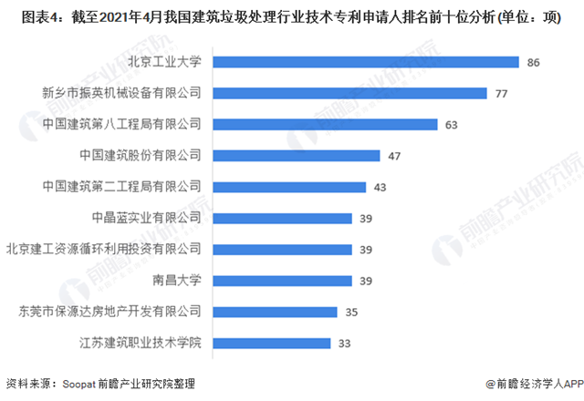 從建筑垃圾處理行業(yè)技術(shù)專利申請人來看,在申請數(shù)量靠前的企業(yè)及單位專利申請數(shù)量均較少。其中,排在前三名的北京工業(yè)大學(xué)、新鄉(xiāng)市振英機械設(shè)備有限公司、中國建筑第八工程局有限公司的專利申請數(shù)量均在100一下,分別為86項、77項和63項。整體來看,建筑垃圾處理行業(yè)的技術(shù)專利集中度仍處在較低水平,申請單位分散。