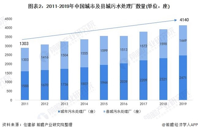 截止2019年底,我國(guó)城市污水處理廠達(dá)到4140座,城市污水處理廠和縣城污水處理廠分別為2471座和1669座。