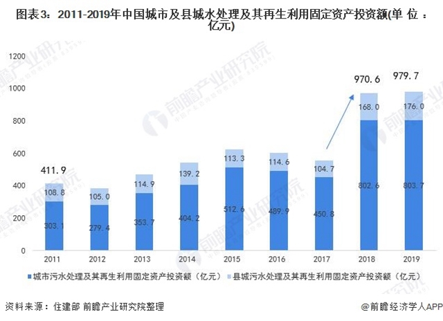 在投資額方面,2011-2017年,我國(guó)城市及縣城污水處理及其再生利用固定資產(chǎn)投資額維持在350-650億元區(qū)間范圍內(nèi)。2018年,我國(guó)城市及縣城污水處理及其再生利用固定資產(chǎn)投資額大幅增長(zhǎng),達(dá)到970.6億元,2019年投資額再創(chuàng)新高,達(dá)到979.7億元。