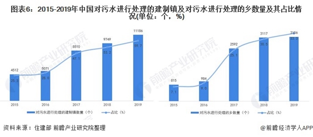 據(jù)住建部發(fā)布的《城鄉(xiāng)建設(shè)統(tǒng)計(jì)年鑒》統(tǒng)計(jì)數(shù)據(jù)顯示,2015年以來(lái),我國(guó)農(nóng)村地區(qū)對(duì)污水進(jìn)行處理的建制鎮(zhèn)及鄉(xiāng)數(shù)量不斷增加。截止2019年底,對(duì)污水進(jìn)行處理的建制鎮(zhèn)及鄉(xiāng)的數(shù)量分別為11186個(gè)和3156個(gè)。