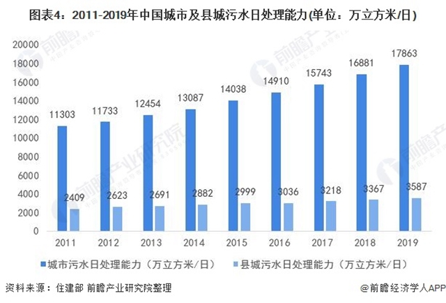 得益于污水處理設(shè)施的建設(shè),城市及縣城污水處理能力穩(wěn)步提升。城市污水日處理能力由2011年的11303萬(wàn)立方米/日上升至2019年的17863萬(wàn)立方米/日;縣城污水日處理能力也由2011年的2409萬(wàn)立方米/日上升至2019年的3587萬(wàn)立方米/日。