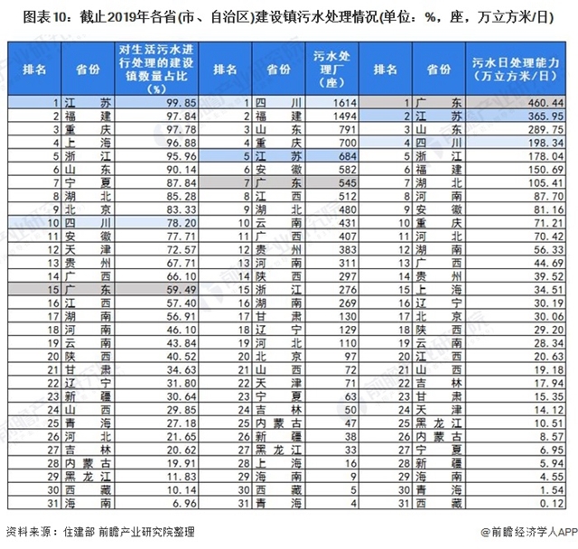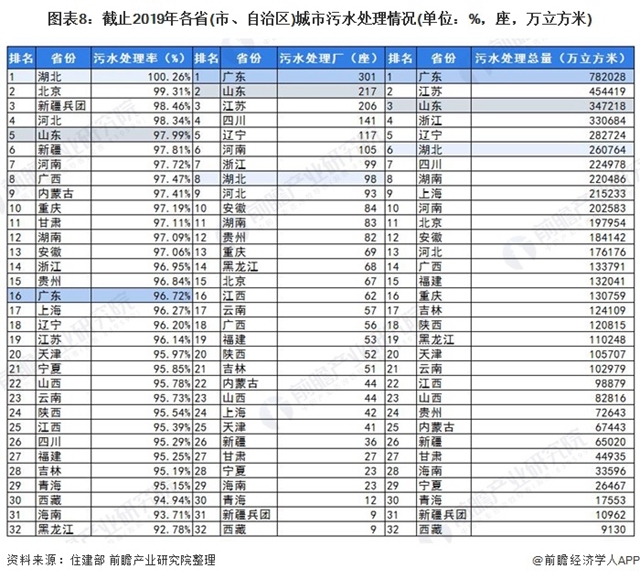 注:污水處理率為前瞻根據(jù)住建部公布的各省(市、自治區(qū))城市污水排放量及污水處理量數(shù)據(jù)進(jìn)行的測(cè)算,污水處理率=各省(市、自治區(qū))城市污水處理量/污水排放量。