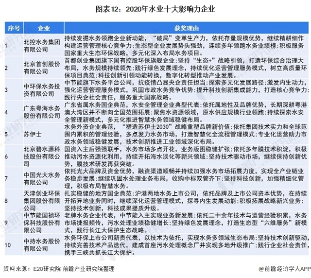 注:E20研究院根據(jù)企業(yè)的業(yè)績(jī)以及他們?cè)谫Y本市場(chǎng)、穩(wěn)健運(yùn)營(yíng)、企業(yè)社責(zé)任等方面的綜合評(píng)價(jià)出2020水業(yè)十大影響力企業(yè)。