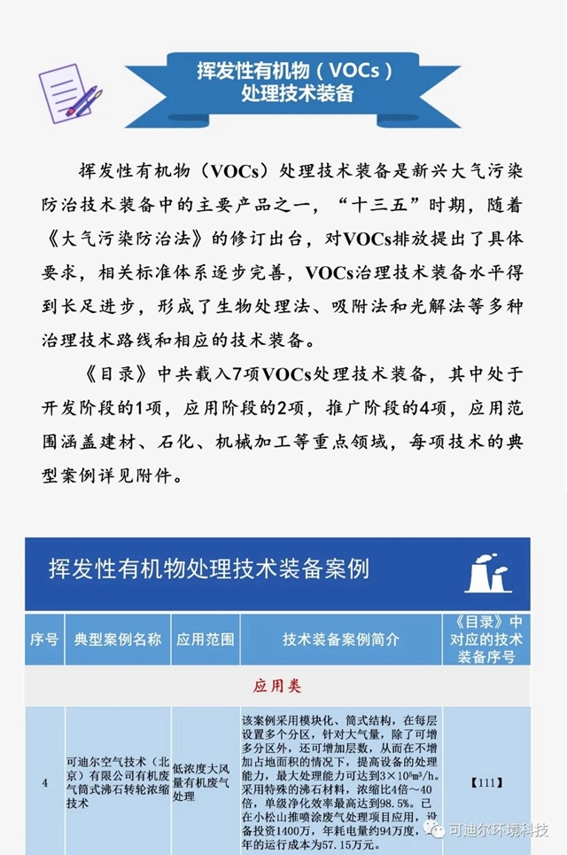 2021年2月25日,中華人民共和國(guó)工業(yè)和信息化部發(fā)布《國(guó)家鼓勵(lì)發(fā)展的重大環(huán)保技術(shù)裝備目錄(2020年版)》供需對(duì)接指南之五:揮發(fā)性有機(jī)物處理技術(shù)裝備典型案例,《目錄》中共載入7項(xiàng)VOCs處理技術(shù)裝備,分別為開(kāi)發(fā)階段的1項(xiàng),應(yīng)用階段的2項(xiàng),推廣階段的4項(xiàng)。其中,可迪爾有機(jī)廢氣筒式沸石轉(zhuǎn)輪濃縮技術(shù)典型案例錄入應(yīng)用階段。