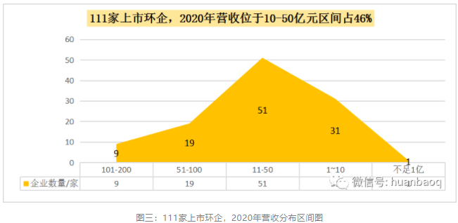 111家上市環(huán)企,2020年?duì)I收在51億元-100億元區(qū)間有19家,龍馬環(huán)衛(wèi)、興蓉環(huán)境首次擠進(jìn)50億元營收陣營;而營收在10億元-50億元區(qū)間的上市環(huán)企,有51家,約占半數(shù);營收區(qū)間位于1億元-10億元的“小而美”上市環(huán)企,有31家,它們大多是科創(chuàng)板企業(yè)(如圖三所示)。