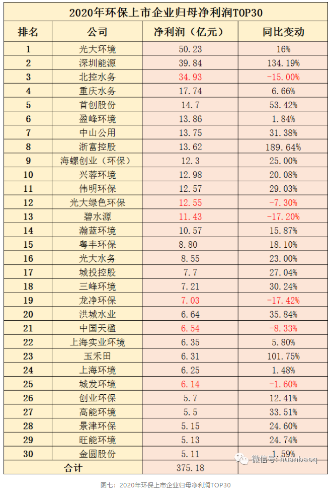 不過,TOP30強(qiáng)中,像業(yè)內(nèi)比較熟悉明星上市環(huán)企,北控水務(wù)、光大綠色環(huán)保、碧水源、龍凈環(huán)保、中國天楹、城發(fā)環(huán)境等,2020年歸母凈利潤都遭到不同程度下滑。