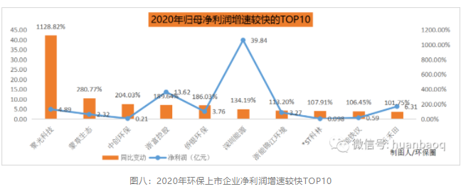 在外界宏觀條件不利、疫情生死攸關(guān)的2020年,仍有一些上市環(huán)企脫穎出來,從凈利潤增速來看,2020年增速較快TOP10上市環(huán)企非常有看點(diǎn)(如圖八所示)。