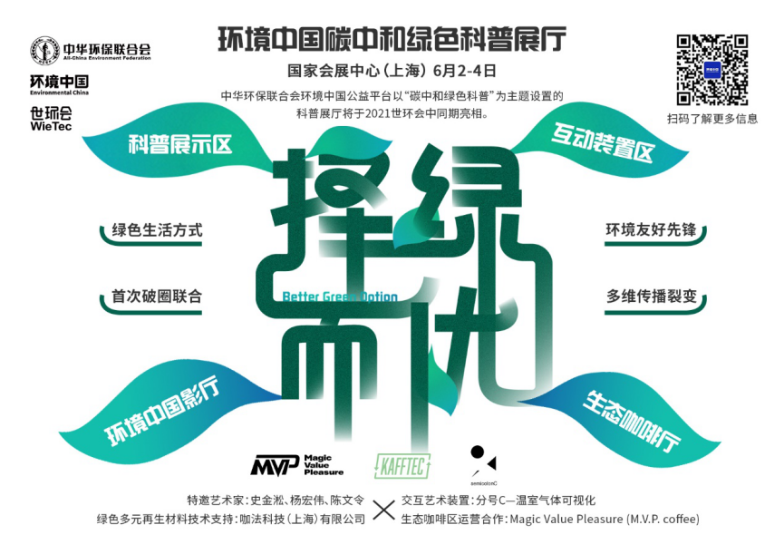 中華環(huán)保聯(lián)合會(huì)環(huán)境中國公益平臺(tái)以“碳中和綠色科普”為主題設(shè)置的科普展廳將于2021世環(huán)會(huì)中同期亮相,該展廳由科普展示區(qū)、互動(dòng)裝置區(qū)、環(huán)境中國影廳、生態(tài)咖啡廳組成。將邀請(qǐng)藝術(shù)名家史金淞、楊宏偉等展出為此次展廳特別呈現(xiàn)的作品,也有青年新媒體藝術(shù)團(tuán)隊(duì)“分號(hào)C”首次呈現(xiàn)將二氧化碳排放數(shù)據(jù)可視化的交互藝術(shù)裝置,觀眾們還能從展廳易讀易懂的文字圖表呈現(xiàn)方式中詳盡地感受“碳中和”跟每個(gè)人的密切聯(lián)系,觀察“碳中和”帶來的行業(yè)巨變,理解“碳中和”的內(nèi)涵意義和歷史價(jià)值;生態(tài)咖啡廳將綠色低碳的消費(fèi)方式體現(xiàn)在咖啡廳的一桌一椅,一杯一盞中;搭建也將全面應(yīng)用綠色多元再生材料,共同倡導(dǎo)大眾進(jìn)行“Better Green Option/擇綠而優(yōu)”的綠色生活方式選擇。通過科普展廳的全面展示,參會(huì)觀眾將和“碳中和”重要議題建立聯(lián)系,認(rèn)識(shí)到在嚴(yán)峻的氣候問題面前需要肩負(fù)的責(zé)任,自發(fā)地加入行動(dòng)中。屆時(shí)將會(huì)邀請(qǐng)多位環(huán)境友好引領(lǐng)者和KOL環(huán)境先鋒達(dá)人參展,與多個(gè)不同領(lǐng)域媒體共同進(jìn)行跨界宣傳與破圈。