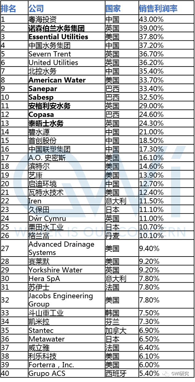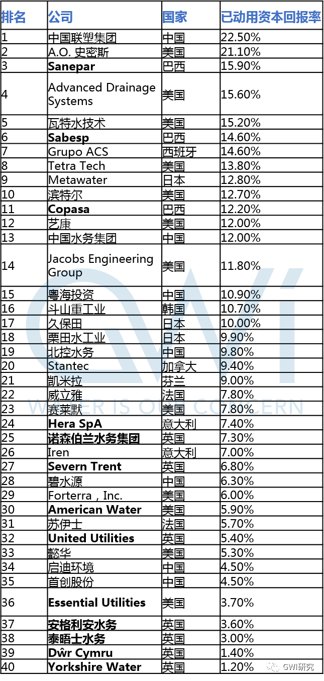 2020年6月,GWI榜單發(fā)布過一份“2019全球水務(wù)行業(yè)利潤大盤點”,對全球的主要水務(wù)公司進(jìn)行了年報分析,并按銷售回報率和已動用資本回報率對企業(yè)進(jìn)行了排名。