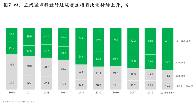 二是四、五線城市釋放的垃圾焚燒項目比例越來越高。目前,(新)一線、二線、三線城市的項目增速都在放緩甚至下降,未來5~10年最大的增長將是四、五線城市。例如,2019年四、五線城市的垃圾焚燒項目占比高達(dá)43.6%,同期的新一、二線城市則分別只占到13.5%和18.5%(見圖7)。
