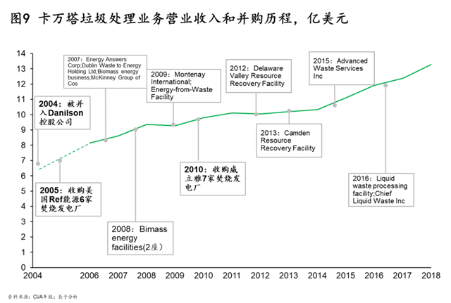 發(fā)達(dá)國家的成熟市場經(jīng)驗表明,環(huán)保政策和行業(yè)標(biāo)準(zhǔn)的趨嚴(yán)會推動行業(yè)整合。例如在美國,自20世紀(jì)90年代以來,一系列針對垃圾焚燒行業(yè)的細(xì)化標(biāo)準(zhǔn)不斷出臺,大量中小型公司受到嚴(yán)峻考驗,擁有技術(shù)優(yōu)勢的卡萬塔通過并購持續(xù)提高市場份額,現(xiàn)已成為美國最大的垃圾焚燒發(fā)電投資商,占據(jù)高達(dá)67%的市場份額(見圖9)。