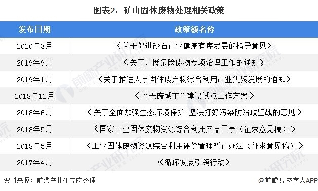 為了消除礦山固體廢物導(dǎo)致的污染,政府現(xiàn)積極推動綜合利用礦山固體廢物。固廢處理行業(yè)作為保護(hù)生態(tài)平衡、實現(xiàn)可循環(huán)經(jīng)濟的重要推動力量,與之相關(guān)的國家政策頻頻發(fā)布。