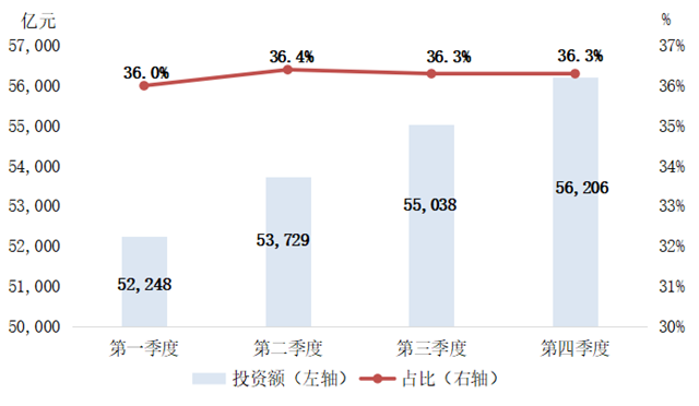 綠色PPP項目投資規(guī)模持續(xù)擴大,投資額占比保持穩(wěn)定。從綠色PPP項目投資額變化看,截至2020年末,綠色PPP項目總投資額增至56206億元,較2019年末新增4532億元,增長8.77%;投資額占比保持穩(wěn)定,截至2020年末,綠色PPP投資額占比達36.3%。