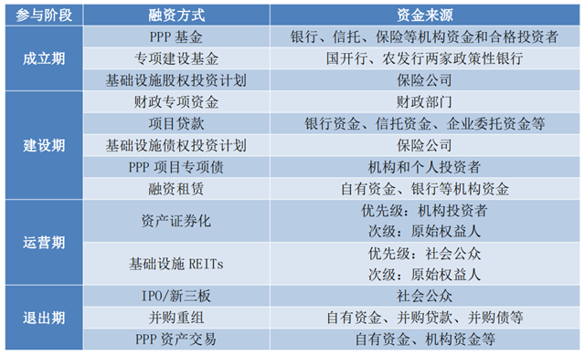第一,PPP項目融資來源有限、融資方式單一,且部分綠色PPP項目融資落地難度大。融資是PPP項目最基礎的一環(huán),在不同階段,PPP項目有不同的融資方式,且隨著各部委、各省市連續(xù)的政策推動,PPP融資方式日益多元化。PPP項目融資模式如下表所示: