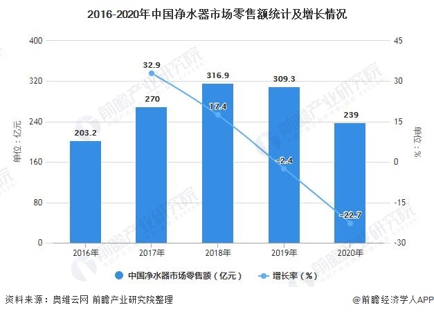 2020年受新冠疫情的影響,一方面房地產(chǎn)開工建設進度放緩,造成凈水器家裝市場的需求的下降,另一方面線下零售店鋪在年初疫情期間客流大幅降低,整體凈水器行業(yè)市場景氣度大幅下降,根據(jù)奧維云網(wǎng)公布的數(shù)據(jù)顯示,2020年我國凈水器市場整體銷量為1016.9萬臺,同比下降10.6%,銷量出現(xiàn)下滑,整體零售額為239億元,同比下降22.7%,達到近三年最大降幅。