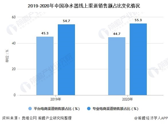 目前凈水器的線上銷售渠道主要分為平臺電商和專業(yè)電商兩大類,2019年凈水器通過平臺電商渠道銷售額占比為45.3%,通過專業(yè)電商渠道銷售額占比為54.7%;2020年平臺電商渠道銷售額占比進一步下滑,2020年凈水器通過平臺電商銷售額占比為44.7%,通過專業(yè)電商銷售額占比上升為55.3%。