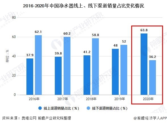 近年來,電商的快速發(fā)展使得凈水器線上銷量規(guī)模不斷擴大,2019年我國凈水器線上渠道銷量占比達48%,2020年受新冠疫情的影響,加上電商直播興起,進一步推動凈水器線上渠道銷量的增長,2020年中國凈水器線上渠道銷量達648.9萬臺,同比增長18.8%,線上渠道銷量超過線下渠道銷量,占比達63.8%。
