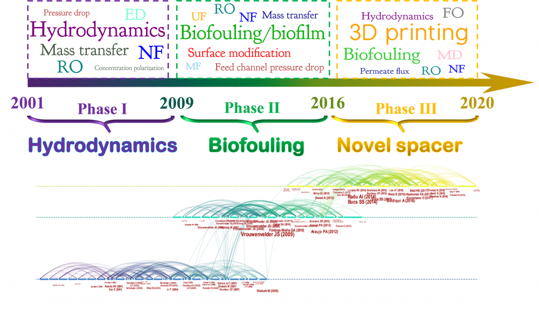 圖3 對(duì)過(guò)去20年所有以“ feed spacer”和“ membrane”為主題的文獻(xiàn)中的關(guān)鍵詞進(jìn)行聚類(lèi)分析和詞頻統(tǒng)計(jì)。所有文獻(xiàn)可以聚類(lèi)成三類(lèi),并且呈現(xiàn)較為明顯的分階段發(fā)展特征,三個(gè)階段對(duì)應(yīng)的關(guān)鍵詞分別為“流體力學(xué)”、“生物污染/生物膜”和“3D打印”。表明研究重點(diǎn)從第一階段(2001——2008年)的流體動(dòng)力學(xué),過(guò)渡到第二階段(2009——2015年)的生物污染,再到第三階段(2016——2020年)的新型隔網(wǎng)設(shè)計(jì)與優(yōu)化。